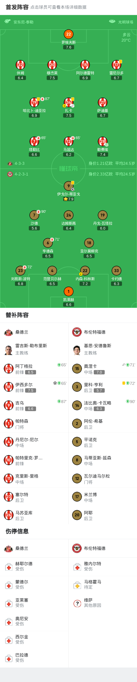 北京时间8月30日英格兰足球顶级联赛第3轮,桑德兰主场迎战布伦特福德。上半场,瓦塔拉单刀破门被判越位进球无效;下半场,雷尼尔多获黄点套餐,沙德主罚点球被罗埃夫斯扑出,奥涅卡助攻蒂亚戈头球破门,勒费埃点射破门扳平比分,补时阶段扎卡助攻伊西多尔头球破门上演绝杀。最终比分桑德兰 2-1 布伦特福德。